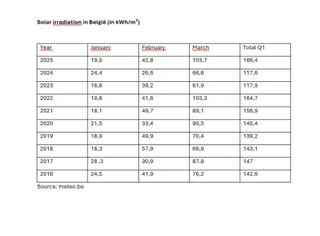 Good news for solar panel owners: the first quarter of 2025 was the best ever in terms of solar irradiation in the past twenty years. "Our panels produced no less than 24% more than in the same period last year when the sun was largely absent," says Maarten Michielssens, CEO of EnergyVision. "Just last month, a single panel even produced a third more energy."